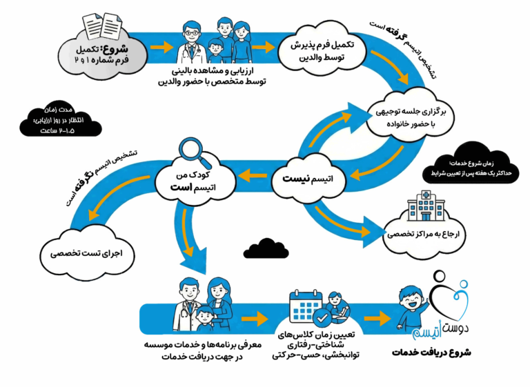 موسسه خیریه دوست اتیسم با هدف حمایت از خانوادهها و ارائه خدمات آموزشی و توانبخشی فعالیت میکند. این موسسه مسیر رشد و پیشرفت کودکان اتیسمی را هموار میسازد. در این بخش شما با فلوچارت دوست اتیسم آشنا میشوید و مراحل دریافت خدمات تخصصی را گامبهگام دنبال میکنید.
